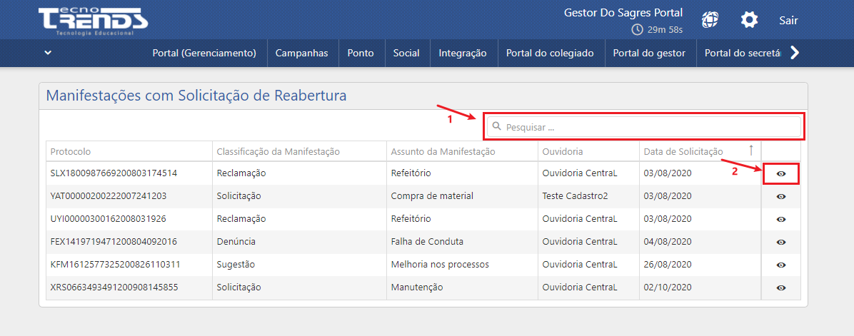 Na interface de Manifestações com Solicitação de Reabertura, serão exibidas todas as solicitações que ainda não foram respondidas.