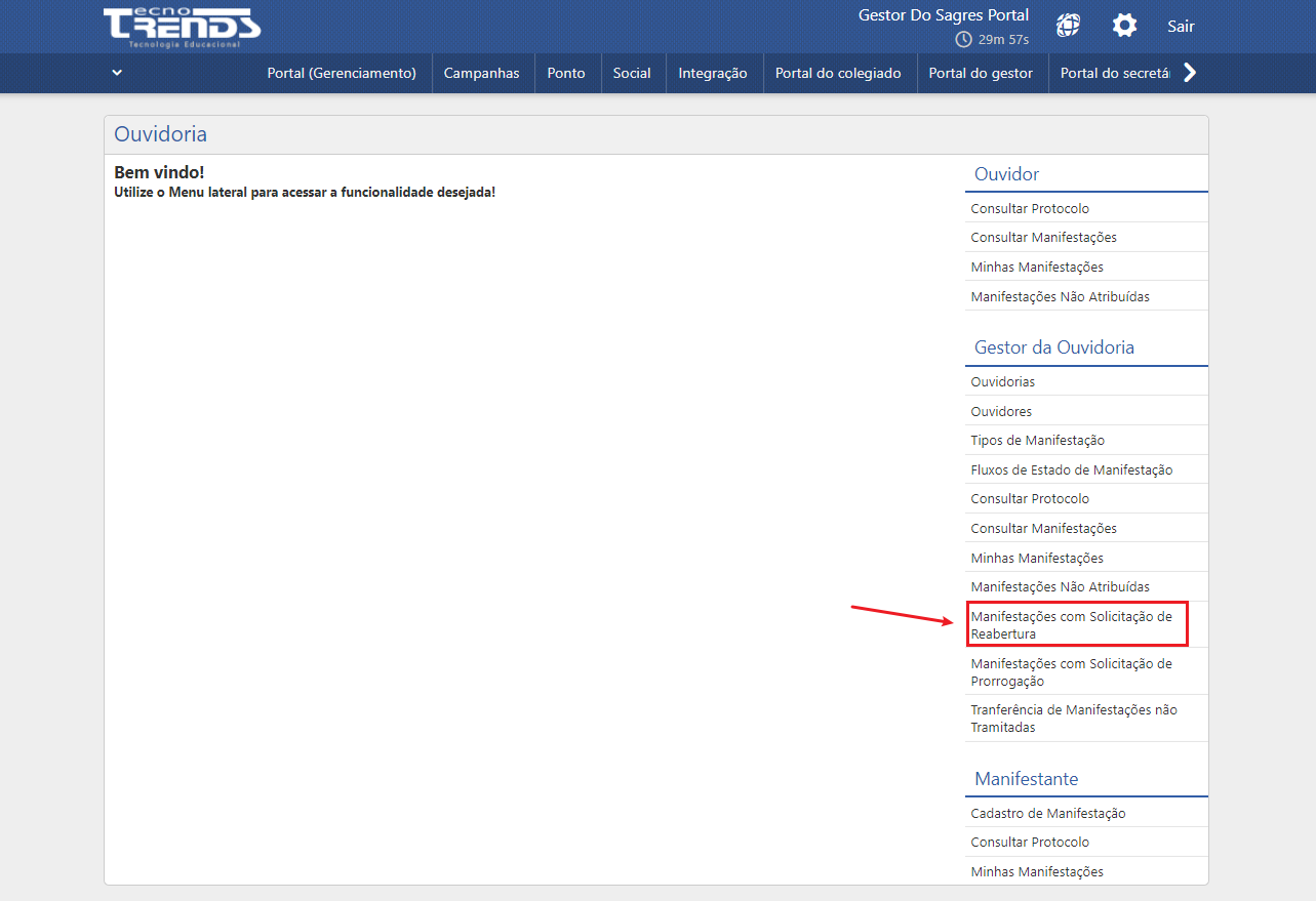 Uma manifestação respondida ou arquivada pode ter a sua reabertura solicitada, ação que dependerá da avaliação do Gestor da Ouvidoria Central. Para acessar o menu de Manifestações com Solicitação de Reabertura, é possível que o usuário Gestor visualize as solicitações de reabertura enviadas pelos ouvidores e/ou manifestantes.