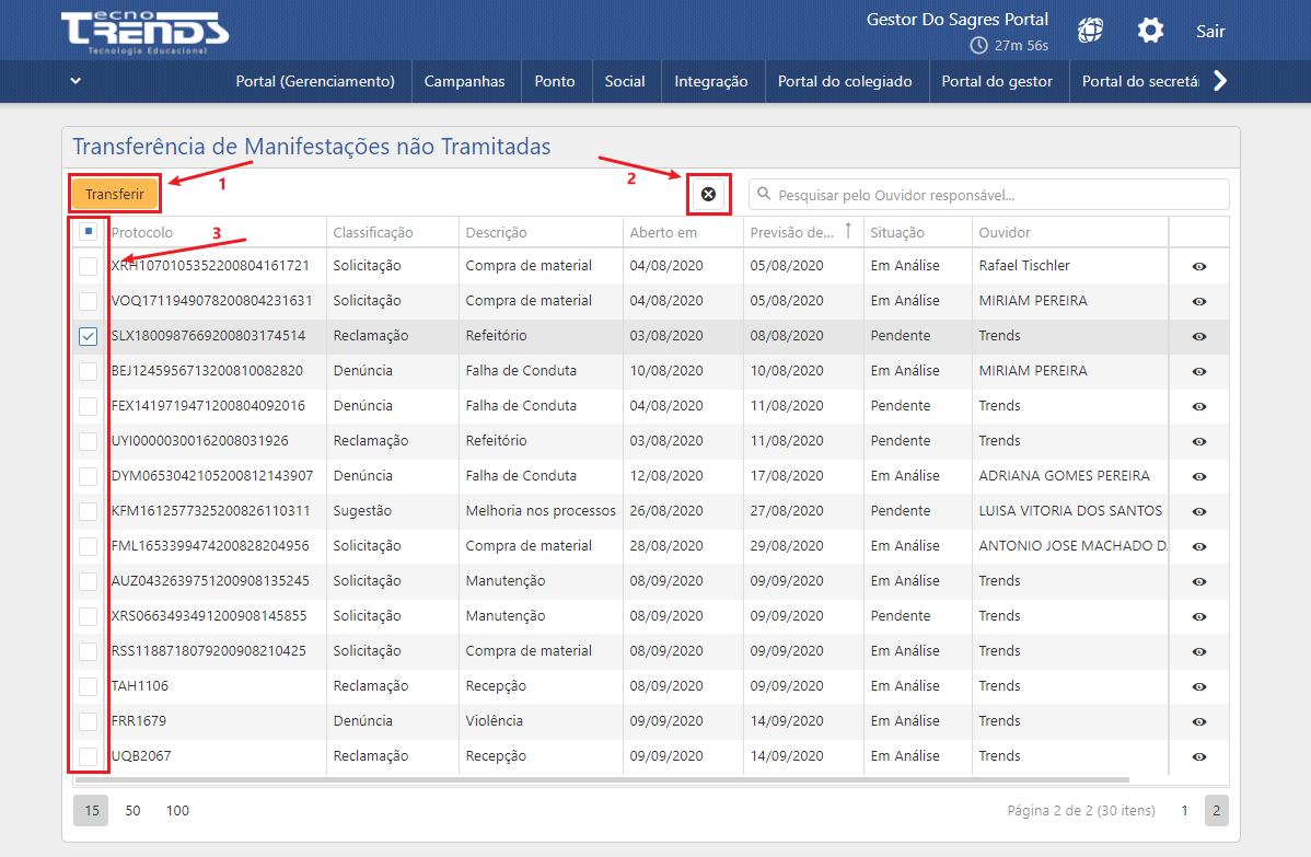 1. Quando identificar na lista qual(s) manifestação(s) deseja encaminhar, deve-se acionar a caixa de seleção (seta 3) correspondente. Para selecionar todas as opções, acione o primeiro botão da lista (localizado ao lado do campo Protocolo);