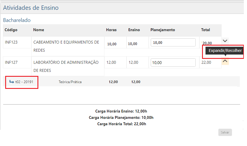 Ao clicar no botão Expandir/Recolher localizado ao lado de cada atividade de ensino, é possível ver as turmas vinculdas a cada disciplina(conforme destaque abaixo).