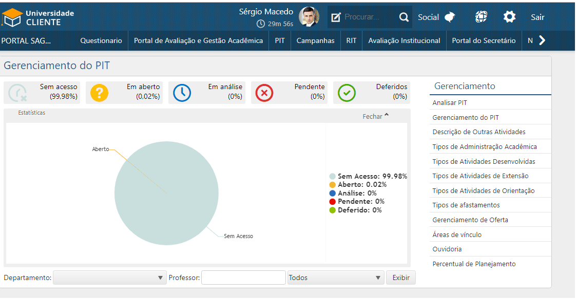 A interface Gerenciamento do PIT tem por finalidade agrupar as informações sobre a situação dos PIT’s dos professores associados aos departamentos nos quais o supervisor possui autorização. Na tela são apresentados gráficos que ajudam na visualização do contexto.