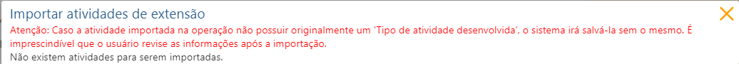 Caso o docente não tenha nenhuma atividade de extensão cadastrada, o sistema retornará a mensagem “Não existem atividades para serem importadas.” Conforme imagem abaixo: