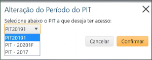 O período do PIT pode ser alterado e, para tanto, o usuário deve clicar sobre o Período apresentado, que está localizado no canto superior da tela. Uma janela será apresentada, o usuário deve escolher o período e logo em seguida clicar sobre o botão Confirmar.