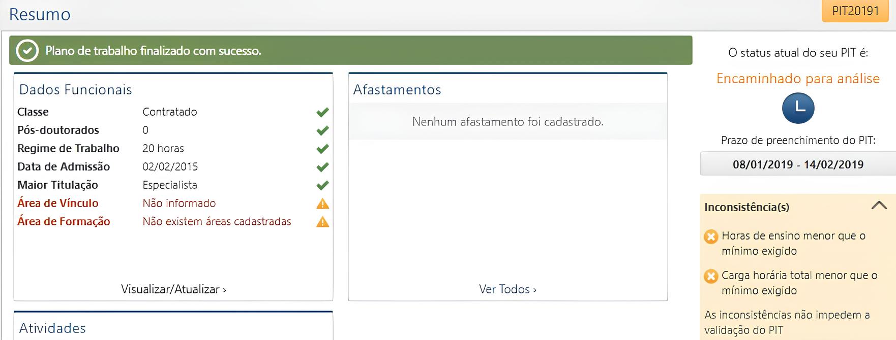 Informações a cerca do PIT (Plano Individual de Trabalho) estão sendo sinalizadas para visualização do usuário. Como a situação atual, o prazo de preenchimento e as inconsistências caso haja. Neste caso da figura abaixo, as inconsistências impedem a finalização do PIT, por isso as informações com destaque em vermelho precisam ser corrigidas.