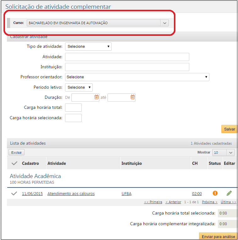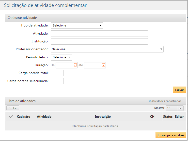 Após selecionar as atividades que deverão fazer parte da solicitação, o Aluno deve enviar a solicitação para análise dos responsáveis clicando sobre o botão Enviar para Análise.