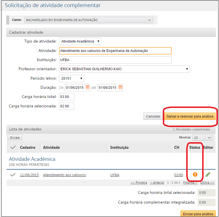 - A quantidade de horas já integralizada para o tipo de atividade que foi selecionado, somada à quantidade de horas da atividade que está sendo enviada para análise, for superior ao limite de horas definido no currículo do Aluno para aquele determinado tipo de atividade;