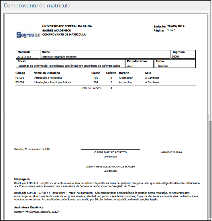 Os Alunos que já estão com suas matrículas completas (ou seja, suas atividades curriculares (disciplinas) e turmas solicitadas estão confirmadas) no Período Letivo vigente podem consultar seus Comprovantes de Matrícula.