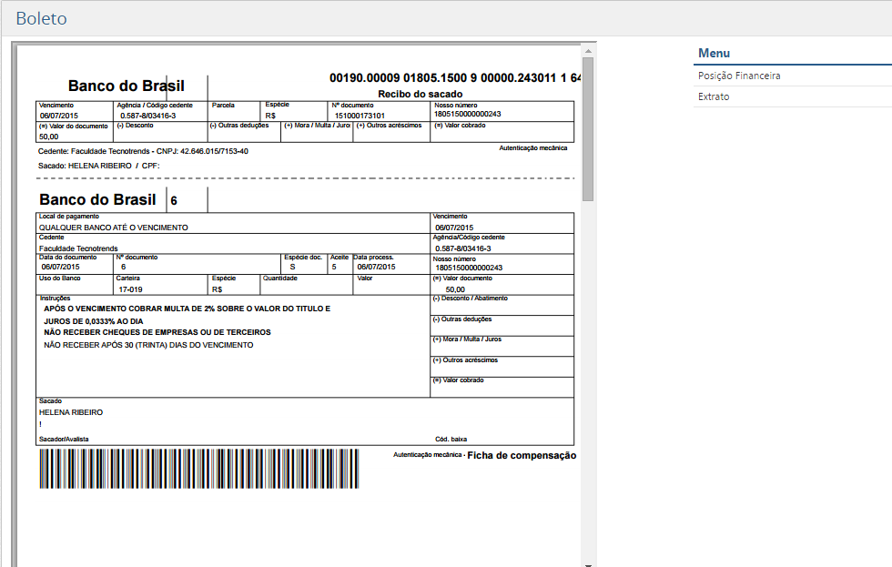 Se a solicitação tem custo e houver integração com o Sagres Financeiro, ao concluir a solicitação, o sistema irá gerar automaticamente um Boleto de Cobrança com o custo da solicitação (lembre-se que alguns serviços podem só ser cobrados acima de um determinado limite de requisições). Neste caso, para o Aluno obter o Comprovante da Solicitação ou o Formulário que deverá ser entregue em conjunto com os documentos comprobatórios das atividades informadas, ele deve acessar a interface do ​menu Solicitações​ > Acompanhamento de Solicitações​​, no Portal do Aluno.