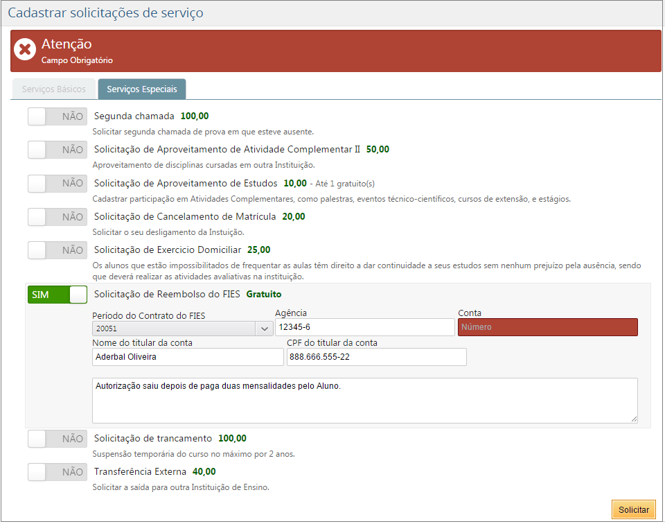 Lembre-se que cada Instituição é livre para definir as características dos seus serviços, isto é, se terão custos, quais os prazos de respostas para as solicitações, se permitem anexos, se possuem instruções etc. (essas definições são feitas através do menu Tabela > Solicitações > Serviços Disponíveis, do Sagres Acadêmico). Portanto, as informações que deverão ser fornecidas dependem das necessidades de cada Instituição.