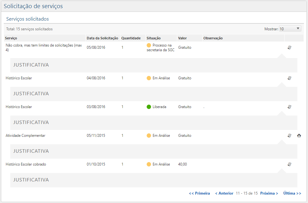 Ao clicar no menu, o sistema apresentará a interface Acompanhamento de solicitações com a lista de todas as solicitações de serviço registradas pelo Aluno, apresentando a descrição do serviço (coluna Serviço), a data em que a solicitação foi registrada no sistema (coluna Data da Solicitação), a quantidade (coluna Quantidade), a situação do atendimento (coluna Situação), o custo da solicitação (coluna Valor) e a justificativa informada pelo Aluno (coluna Observação).