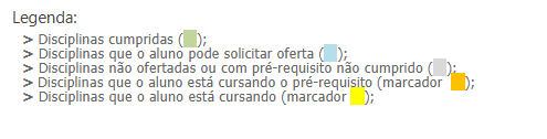 Nesta rotina, o aluno visualiza seu fluxograma do curso, em que pode observar sua situação em relação ao cumprimento do currículo que está cursando, isto é, quais atividades curriculares foram cumpridas, quais atividades ele está matriculado, quais atividades ele está apto a cursar etc. Além disso, o aluno pode indicar quais disciplinas pretende cursar no próximo período letivo.