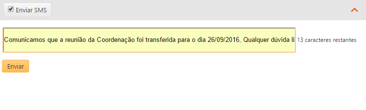 Nesta opção o usuário deverá escrever o texto da mensagem que será enviada por SMS (máximo de 160 caracteres). A cada momento a aplicação indica quantos caracteres ainda podem ser preenchidos (caracteres restantes).