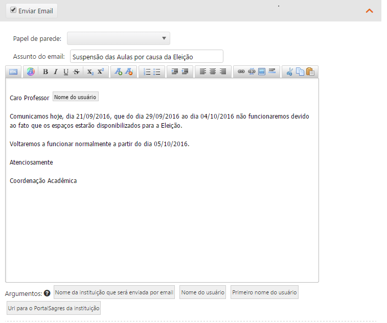 No texto do E-mail podemos incluir argumentos que serão preenchidos dinamicamente quando a mensagem for enviada. Nesta interface, os argumentos listados são denominados de Argumentos Globais, pois estão disponíveis para todas as mensagens.