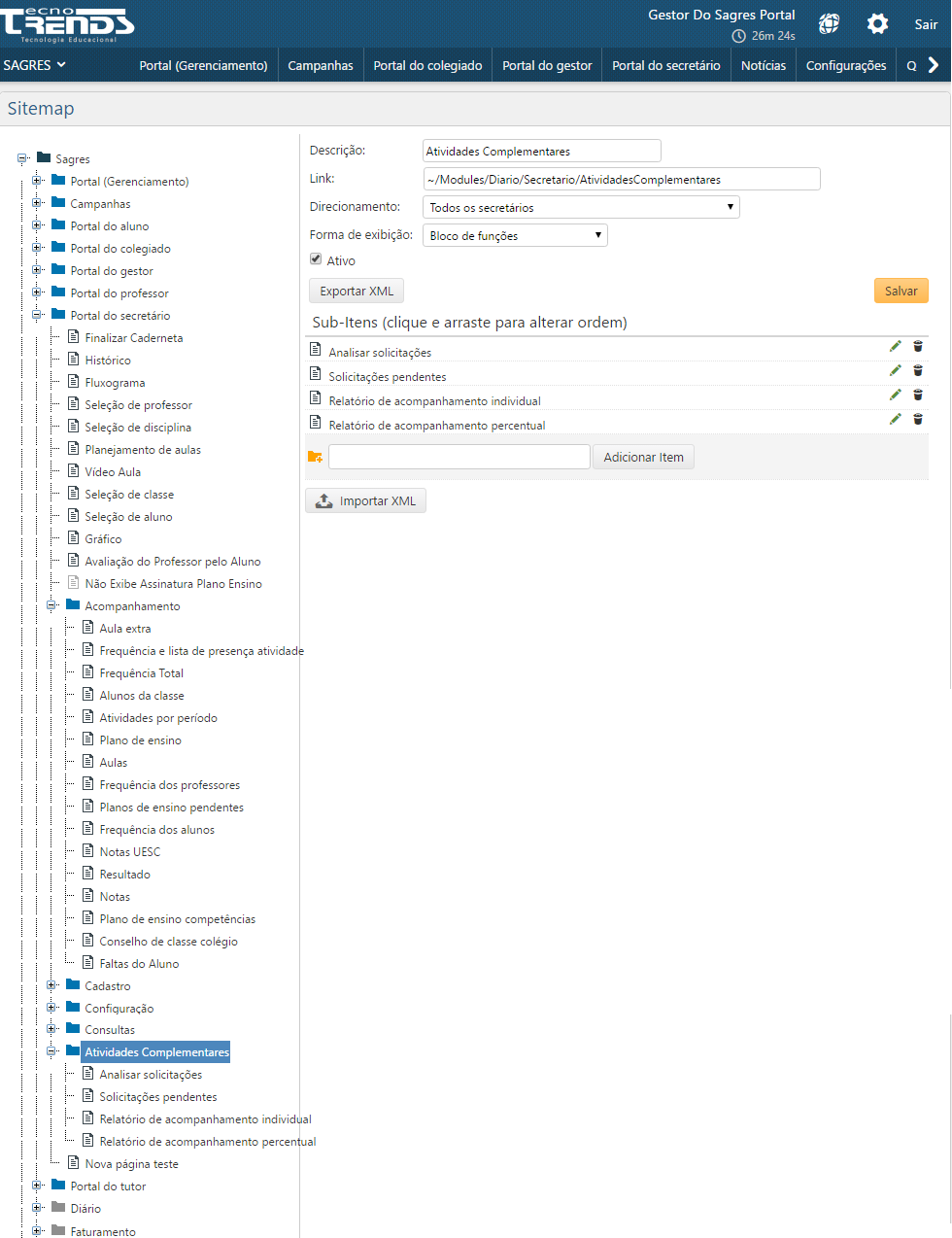 O SiteMap representa a estrutura hierárquica de links que apontam para todas as páginas do Portal e para as páginas dos Módulos instalados no Portal (Acadêmico, Diário, Financeiro, Acervo, etc.). Além disso, essa funcionalidade permite que o Gestor defina quais itens ficarão disponíveis para navegação, quais serão os direcionamentos dos itens e como estes itens serão organizados hierarquicamente.