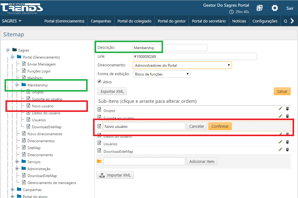 O usuário também poderá renomear qualquer subitem clicando sobre o ícone de edição exibido no final da linha de cada subitem. Dito isso, o sistema irá alterar a apresentação da linha com os dados do subitem que será renomeado, de forma que o usuário possa fazer a alteração desejada e, em seguida, clicar no botão Confirmar, para que a aplicação registre a alteração realizada no sistema. Observe a figura abaixo, onde o subitem Novo Usuário (ressaltado na cor vermelha) do item Membership (ressaltado na cor verde) será renomeado.