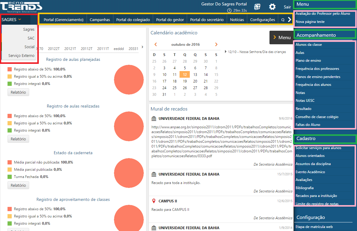 2º Nível – Menus do ambiente selecionado – são visualizados na barra de menus horizontal (no topo da interface) quando o ambiente é selecionado. O ambiente selecionado na figura abaixo foi o SAGRES. Os menus do ambiente SAGRES estão destacados na cor amarela. Ao selecionar um menu de um ambiente, o sistema apresenta as funções desse menu, que poderão estar organizadas em Grupos.