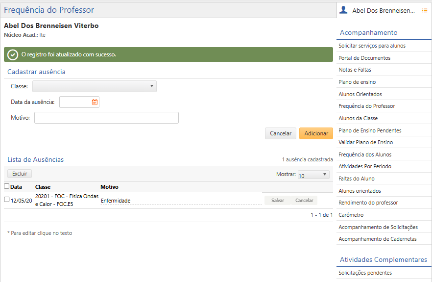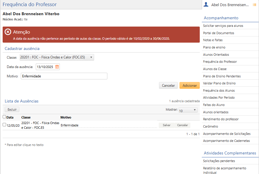 Se houver ausência, o sistema exibe a Data da ausência, Período/Código e nome da Atividade/Classe, bem como o Motivo da ausência.