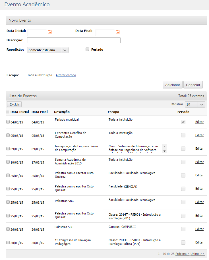 Para incluir um evento, o usuário deverá informar todos os dados necessários (Data Inicial, Data Final, Descrição, Repetição (Somente este ano, ou Anualmente), Feriado (campo marcado = SIM, campo desmarcado = Não), e o Escopo), e no final deverá acionar o botão Adicionar, presente na interface. O sistema emitirá uma mensagem de erro caso o usuário viole alguma regra da interface (exemplo: não informar a data final), e emitirá uma mensagem informando o sucesso (Registro atualizado com sucesso), caso não ocorram erros.