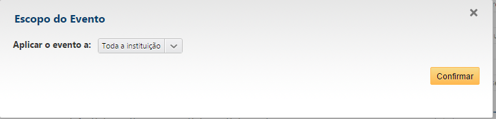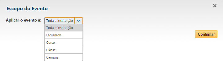 O escopo padrão de um evento é para “Toda a Instituição”, mas se o usuário quiser alterar, basta clicar sobre a opção “Alterar Escopo“, encontrada ao lado do campo Escopo, na interface de Cadastramento de Eventos e escolher a opção desejada entre as apresentadas pela aplicação (Toda a instituição, Faculdade, Classe, Campos). Em seguida, deverá acionar o botão Confirmar, presente na interface.