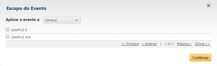 Se selecionar o escopo aplicado a​ Campus, o usuário deverá marcar os Campus envolvidos com o evento em questão e, em seguida, deverá acionar o botão Confirmar.