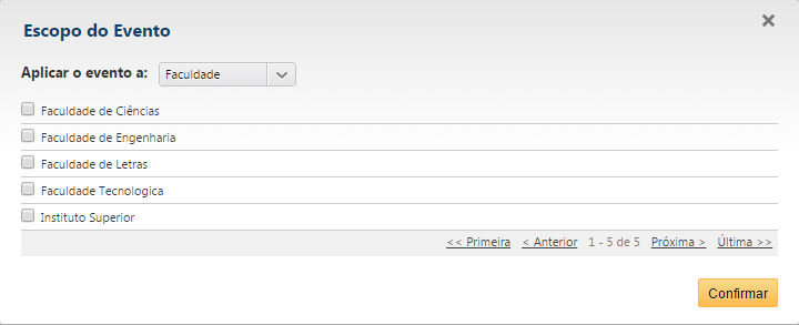 Se selecionar o escopo aplicado à Faculdade, o usuário deverá marcar as Faculdades envolvidas com o evento em questão e, em seguida, deverá acionar o botão Confirmar.