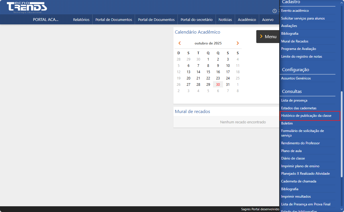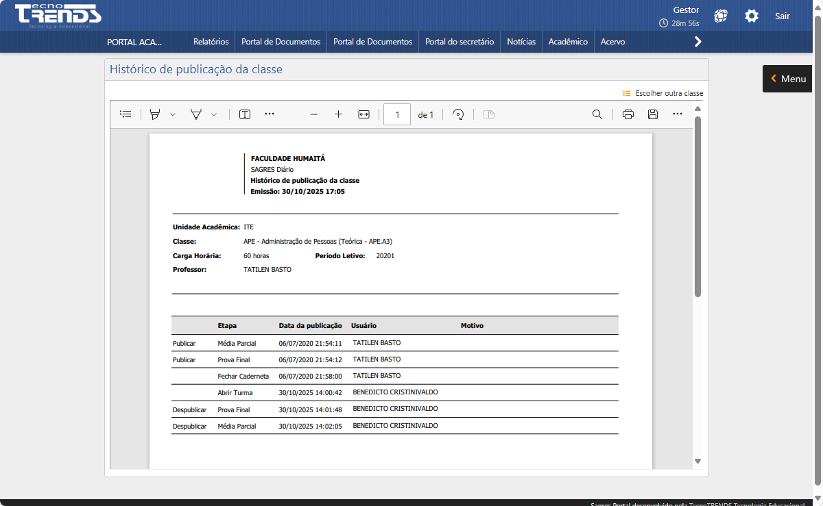 Esta rotina permite que o Secretário acesse o Histórico de Publicação de uma Classe, ou seja, a lista das datas de todas as publicações das médias parciais, dos aproveitamentos nas provas finais, etc., como também das despublicações que foram necessárias. A Classe deve estar associada a um dos Departamentos (ou órgãos equivalentes), a que o Secretário tem acesso. Com essas informações, o Secretário pode verificar se determinadas ações foram executadas dentro dos períodos ou nas datas definidas para elas no Calendário Acadêmico. Acessível pela interface do menu Consultas => Histórico de Publicação da Classe, do Sagres Diário, no perfil do Secretário.