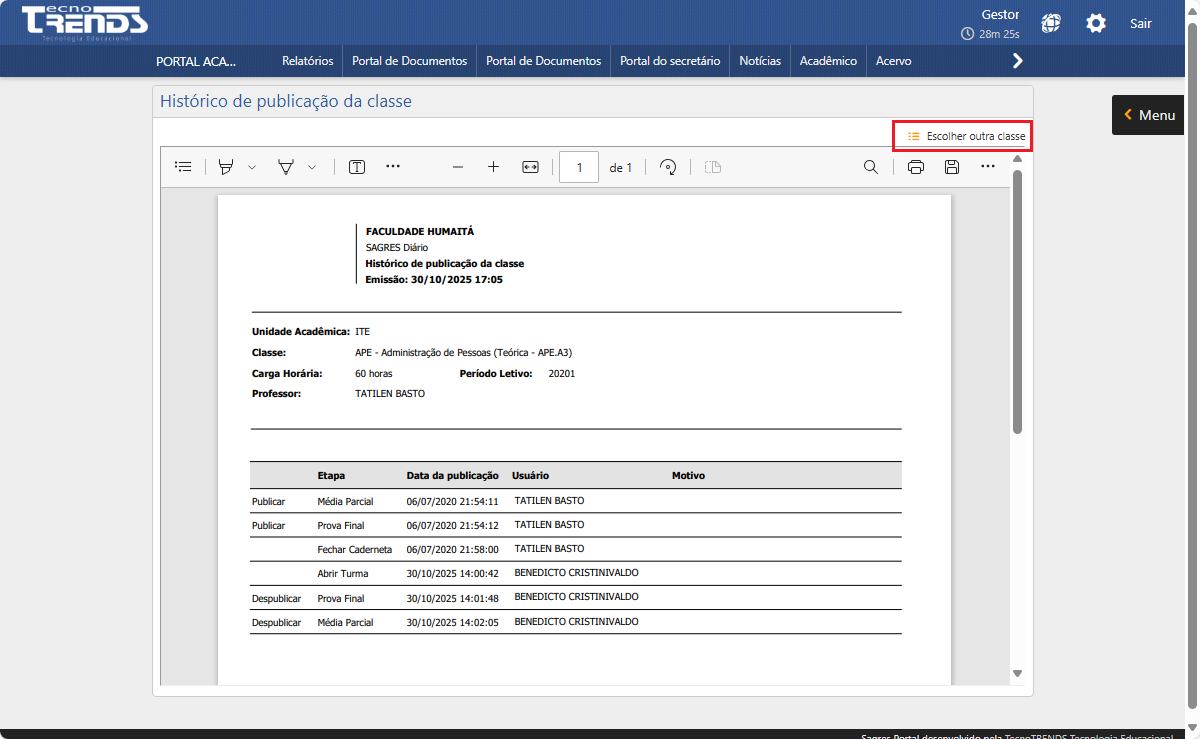 No final, o usuário poderá escolher outra classe (entre as que ele tem acesso) para trabalhar, acionando a frase “Escolher outra classe“, presente no cabeçalho da interface.