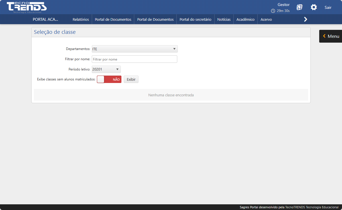 Ao clicar no menu citado, o usuário deverá inicialmente selecionar a classe desejada e, para isso, ele deverá selecionar o Departamento que a classe está vinculada (campo Pesquisar), o Período Letivo da classe, e se desejar, informar as iniciais de quaisquer dos nomes que identificam a classe (campo “Digite aqui para filtrar”), e, em seguida, deverá acionar o botão Exibir (presente na interface), para que o sistema apresente a interface Seleção de Classe com a lista de todas as classes que atendem aos filtros informados, para que o usuário selecione a classe.