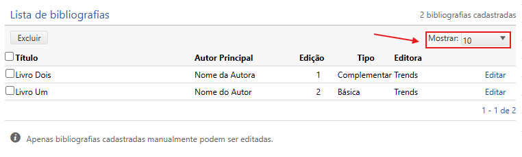 A interface indica o total de bibliografias cadastradas e permite que sejam apresentadas 10, 20 ou 30 bibliografias a cada vez (campo Mostrar, apontado pela seta).