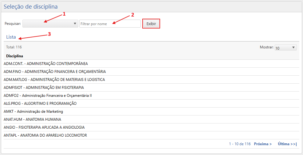Esta interface permite que o usuário defina quantas disciplinas serão apresentadas de cada vez, selecionando 10, 20 ou 30 no campo Mostrar. A interface também informa o total de disciplinas recuperadas.