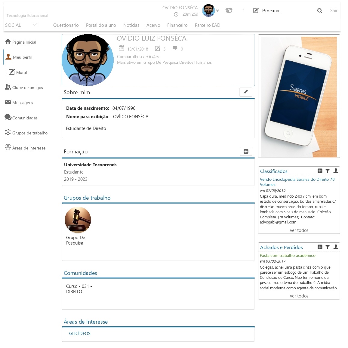 O Meu perfil é uma guia de acesso ao perfil de um usuário no SAGRES Social. Nela, é possível visualizar e cadastrar alguns dados e informações a respeito dos membros.